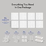Organizer Your Home In Style: This pegboard for wall combination kit is versatile for many areas of your home. The pegboard display is great for wall organizing, craft room storage, and ornaments display, and even makes the perfect baby organizer. Our wall peg kit can be used as a mail holder, office organizer, entrance organization, bathroom storage, playroom & and kids toy storage, etc. Easy To Install: The combination set of our panel pegboard is high load-bearing and can hold up to 20 lbs, or more if secured with nails. With this white tool storage, you can choose nail-free installation using the stickers on the installation frames or fasten with nails on un-smooth surfaces. If you have any questions regarding the installation processes, we will help you resolve it in a timely manner. Creative Combination: With our wall board organizer, you can set your pegboards up in a variety of ways for different needs. The combination set contains 4 pegboards and 14 pegboard accessories, which allows you to create your storage style. If you are not sure which way to go, please feel free to use our images for inspiration. Life Time Guarantee: Please feel free to tell us what you think and if you come across any damages, we will replace it for free.