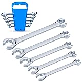 ▲ PREMIUM QUALITY - Professional grade chrome vanadium steel construction with rust and corrosion preventative mirror chrome finish provides maximum strength and durability to withstand daily uses ▲ WIDE APPLICATIONS - Must-have tools to tighten or loosen hexagonal nuts, fittings, couplers and fasteners for automotive repairs, plumbing and HVAC jobs, wherever lines, tubes or pipes are present ▲ DOUBLE-END DESIGN - Each wrench has 2 different sizes on the two ends, saving space in your toolbox. Permanent size marking stamped at both ends and on both sides to quickly identify and determine opening size ▲ 6-POINT HEAD WITH RADIUSED CORNER - Deep 6-point opening grips all six sides of fasteners to maximize their contact for easier turning. Our unique radius corner design prevents nuts and fittings from rounding off and stripping ▲ 15° ANGLED AND 15° OFFSET - 15-Degree angled opening can be flipped over to gain additional access angles and create more turning room in limited spaces; 15-degree offset provides enough clearance for hands or obstructions in tight areas ▲ NO SKIPPED SAE SIZES - Set includes a full range of standard SAE flare nut wrench sizes from small to large: 1/4” x 5/16”, 3/8” x 7/16”, 1/2” x 9/16”, 5/8” x 11/16”, 3/4” x 7/8” ▲ COMPLETE SET - Package comes with a heavy duty plastic rack for easy storage, organizing and carry. The whole set is backed by lifetime quality guarantee for worry-free purchase.