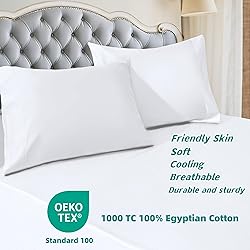 1000 Thread Count Cotton Pillow Cases: Our 1000 thread count pillow Using high count combed cotton yarns for weaving, the density far exceeds that of ordinary pillowcases . The fabric is silky smooth and flowing like real silk, instantly releasing a comfortable sleeping experience. Every time you turn over, it feels like a gentle touch from the clouds, making the sleeping ceremony full of luxury and comfort. Breathable & Cool Fabric:Double sided breathable. Sweating late at night? It doesn't exist! The air circulates freely between the yarns, keeping them dry and cool all night long, especially suitable for those who are prone to sweating and require constant temperature throughout the year. Durable & Easy to Care. Our luxurious pillow cases are strong and durable and do not fade or shrink even after multiple washes. These pillow covers retain softness and smoothness wash after wash, so you can enjoy their luxury for a longer time Hypoallergenic. From the fabric to the thread and accessories, our pillowcases have been scientifically tested.These pilllowcases are safer choice for your health and preferred material for kids and anyone with sensitive skin Standard Pillowcases Set: Includes 2 Pillowcases: 20 "W x 26" L