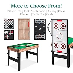 FUN FOR FAMILY & FRIENDS: 13 options for friendly competition provide hours of fun for the entire family! Mom and dad can enjoy a game of checkers while the kids (Ages 3+) take aim with the archery set VERSATILE 13-IN-1 TABLE: Interchangeable play fields let you play hockey, foosball, billiards, shuffleboard, ping pong, chess, cards, checkers, bowling, sling puck, basketball, tic-tac-toe, and archery; Billiards and ping pong are not regulation size SPACE-SAVING DESIGN: All play surfaces stack between the billiard base and foosball table-includes three storage options; two accessory bags, a hammock, and one nylon pocket organizer STURDY BUILD: 4 sturdy wooden legs sit on adjustable non-slip feet for added stability; natural wood handles on the foosball table complete this set with functional charm; all materials are ASTM & CPSIA-certified ALL ACCESSORIES INCLUDED: Comes complete with over 50 accessories for you and your guests to enjoy every game to their fullest; chess, checkers, billiards, and even a bow and arrow set await!; OVERALL DIMENSIONS: 49"(L) x 41.5"(W) x 31.25"(H)