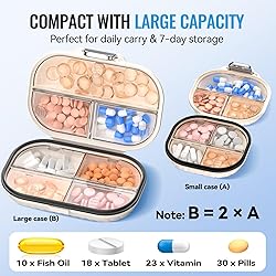 Medication Tracker and Reminder: Our pill case with a built-in medication tracker, easy to turn the disc to record the day of the medication. Never miss a dose again and easily track your medications wherever you go. 7 Compartments Large Capacity: Our pill organizer features 7 compartments to provide ample space to meet all your pill needs, 6 compartments for small pills, and the top large compartment for large vitamins and capsules). The inner transparent lids of the small pill organizer are removable to help you easy to fill medicine in. Waterproof and Moisture-Proof: This travel pill organizer with a triple seal design ensures your medications' integrity, even in challenging environments. And the transparent plastic lids help to distinguish each pill and organize them better. Food-Grade Materials: Your health and safety are our priority. Our small pill case is made with high-quality food-grade PP materials, NO-BPA. This pill organizer ensures the safety of your medication storage. Compact and Portable Pill Case: The size of the small pill box measures 3.15" Lx3" W x 1.55" H, and the large medication container is 4.4" Lx3" W x 1.55" H, the compact size makes this travel pill case perfect for on-the-go use and a must-have for any travel activities.