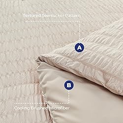 Certified Safe Fabric: This king size comforter set is certified by OEKO-TEX Standard 100, ensuring it meets high safety standards and is free from harmful substances; made from soft 100% microfiber, the interior is filled with premium 240 GSM 100% Polyester, providing a cloud-like sleeping experience suitable for all seasons Anti-Wrinkle Textured Design: Unlike traditional, plain duvet covers, our slightly pleated seersucker texture is both beautiful and delicate; creates a vivid three-dimensional wavy pattern; the striped texture enhances this design, which is wrinkle-resistant and easy to care for; the gentle seersucker queen bedding set adds a unique sense of romance and elegance to your room Deep Pocket Fitted Sheet: Our stretchy deep-pocket fitted sheet easily fits any 12-15 inch mattress and stays in place no matter how you toss and turn; the soft brushed microfiber fabric provides just the right amount of warmth and comfort What's Included: The king size bed set includes 1 Comforter (104" x 90"), 2 pillowcases (20" x 40"), 2 Pillow Shams (20" x 36" + 2"), 1 Fitted Sheet (78" x 80" + 14"), 1 Flat Sheet (108" x 102"); the set is packed in a vacuum bag; simply dry on low heat or gently fluff under the sun to restore its loft Easy Care: Our bed in a bag set is easy to care for; simply machine wash in cold water; if you have any questions or concerns, our customer service team is here to help