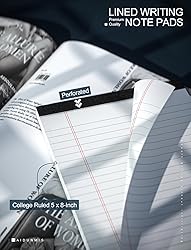[ENJOY WRITING AGAIN]: The note pads 5x8 lined paper pads has black lines and double red margin lines on left, narrow-rule format provides plenty of space for your notes. Small legal pads smooth, premium-weight paper allows your ballpoints and ink gel pens to glide across the page. Legal pads 5x8 college ruled writing stays on the surface and resists ink bleeding and show-through. The note paper pads won't yellow over time, thicker than average writing pads for smooth writing with less ghosting. [LINED LEGAL PADS]: Each package small notepads 5x8 come with 12 pieces legal pad college ruled lined spacing (9/32 inch) paper. These small legal pads 5x8 white letter-size 5 in. by 8 in. legal note pads perfect for writing notes, letters, thoughts and list. These lined paper note pads 5x8 inch sufficient quantity can meet your daily usage and replacement, without worrying about running out of paper. The writing pads 5x8 size notepad enough to record all your thoughts, no more forgotten things. [KEEP NOTES SECURE]: Each paper pads 5x8 has black top bindings. The memo pads 5x8 perforated top edge allows for easily and neatly removing individual sheets of paper. Lined notepad has sturdy header and bindings keep the pages of your crucial notes protected, writing pad 5x8 won't fall apart under pressure like some lesser notepads. White legal pad 5x8 features a cardboard backing for extra support when you writing or taking note, lined note pads 5x8 perfect for writing on the go. [WIDE RANGE OF APPLICATIONS]: Perforated edge legal white legal note pad 5x8 for everyday writing is good for students, teachers waitress, home, school or office, business and more. You can use small legal note pads 5x8 in create reminders, to do lists, notes, and more. Take your grocery list with you on the go or stash that to-do in your pocket. There are measures 5x8” notebooks & writing pads, 12 pieces in a pack and 30 sheet per notepad, so you always have one available when it's needed. [PERFECT CHOIC]: Small pads of paper 5x8 in can be practical product for students, colleagues and friends. You never know when an idea will pop into your head and you’ll want to remember it for later. They are ruled pages and 5 x 8 inch memo small notepads suitable for anyone and for many purposes. The things to do notepad 5x8 is the first choice, so that your friends can also become idea catchers. It is the icing on the cake in their daily life to refresh and brighten up their day.