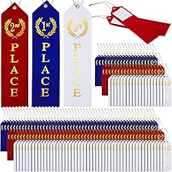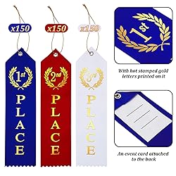 Package content: you will receive totally 450 pieces award ribbons with event card and rope, in blue, red and white, each color accounts for 150 pieces, sufficient quantity for sports event or other school competitions 3 Different designs: the flat carded award ribbons are respectively designed in 3 patterns, include 1 st place in blue color, second place in red and 3 rd place in white, thoughtful designs for you to apply, helpful tool for celebrating the achievement With card and rope: each of these competition ribbons are designed with a event card in the back for recording the event and winner's name, and a gold rope to display the award, also convenient for hanging and displaying Quality material: these first second and third place ribbons are made of satin material with hot stamped gold letters printed on it, and an event card attached to the back, not easy to fade or break, will company you for a long time Size detail: each ribbon measures approx. 8 x 2 inches with a rope coming out from the top of the ribbon, proper size with nice appearance, the awardee will feel happy and proud when receiving them