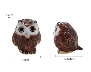SIZE: Measuring approximately ¾" Wide x ⅞" Long x ⅞" High, this cute collectible will look great in your bedroom, coffee table, or bookshelf. HANDCRAFTED: Made with high-grade ceramic and formed into animal shapes in their usual pose. The hand-painted pieces show intricate elements and detailed coloring that you will surely appreciate. UNIQUE DESIGN: Every piece is slightly different since they are handmade. As such is the nature of the items, details may vary from piece to piece thus no two are alike making them special indeed. CHARMING PIECE: If you are an owl lover, this tiny figurine is for you! You can mix and match with other decorative animal pieces to create a menagerie in your home. This figurine can add cuteness to your terrarium, tray garden, or craftworks like bracelets and earrings. USAGE, CARE, AND HANDLING: This product is intended for ages greater than 15 years and older. We suggest filling a bowl with warm water and a very mild dishwashing liquid. Dip a very soft cloth into the water and gently clean the porcelain figurine until it's free of dirt.