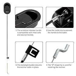 - adjust the sofa for more comfortable and convenient. Sturdy Metal Holder-Makes the handle and the cable more firmly Quickly Install Recliners- Only need a screwdriver and pliers, you can install it in 10 minutes or more less. Package include: 1* Recliner handle replacement 1* Recliner Cable Replacement Notice: 1. Please allow a small size error due to manual measurement. 2. Due to different computer screens, please understand that the color of the actual item may be slightly different from that shown in the picture