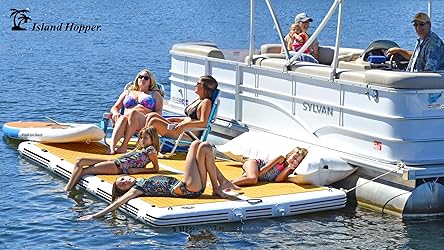 - Transform your waterfront experience with the Island Hopper Patio 15ft inflatable floating docks designed for relaxation, fun, and versatility. Whether you're extending your boat dock, lounging by the lake, or hosting friends, this inflatable boat dock offers the ideal space for up to 10 people with a 2000+ lbs capacity. Ideal for sunbathing, swimming, or just hanging out on the water, this platform is your go-to pool platform for kids and adults. Crafted from heavy-duty PVC with heat-welded seams, this inflatable floating platform is built to withstand the elements, providing long-lasting durability and resistance to punctures. The float dock with non-slip EVA foam surface ensures a safe, comfortable space for all ages, offering a stable footing for everyone. Setting up is quick and easy with the included 15 PSI electric inflator and a hand pump backup for convenience. Once you're done, it rolls up compactly for easy storage and transport, making it ideal for all your outdoor adventures. Whether you're boating, camping, or lakeside relaxing, this blow up dock for lake is ready to go wherever you need it. This floatable dock isn't just for lounging; it's incredibly versatile. Use it as an inflatable platform or a staging area for watersports. Spacious enough for your gear, chairs, and coolers, it offers a stable surface for group fun. With multiple anchoring points and handles, you can easily attach it to your boat or pontoon for added convenience. The Island Hopper Patio Dock 15ft Inflatable stands out with its premium construction, versatility, and easy setup. Upgrade your outdoor adventures with these durable, high-quality boat dock floats and enjoy endless fun on the water!