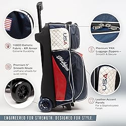Built to last with 1680D Ballistic fabric - the ultimate KR Armor protection, this premium triple roller bowling ball bag keeps your gear secure and ready for every game or tournament. Enjoy a sleek, durable design with leather accent panels and premium YKK luggage zippers for smooth access and longlasting quality. Roll with confidence on premium 5” Smooth Kruze urethane wheels that glide quietly and effortlessly through bowling centers and airports. Easily lift and move your bag with convenient end handles that make loading into cars or onto racks simple and comfortable. Keep your bowling balls safely in place with internal retaining straps that prevent movement and protect your equipment during travel. Stay organized with a large shoe compartment that fits up to size 15, multiple zippered side pockets, a top accessory pocket, and a retractable locking handle that extends to 42 inches. Zippered accessory pockets on both sides Separate top accessory pocket Retractable flush locking handle extends to 42"