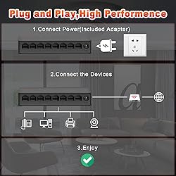 1000 Mbps High Speed Ethernet Switch:This 8-port Gigabit switch uses the latest high-speed and low-power consumption Ethernet chip,only 2.5W in full load conditions. Gigabit that Saves Energy Latest innovative energy-efficient technology greatly expands your network capacity with much less power consumption and helps save money. (Note: It's not PoE Switch) 【Easy to Use,Plug & Play】Unmanaged network switches are very simple to operate, plug and play.Each port supports MDI/MDIX auto-flip and duplex/rate auto-negotiation. Easy setup with no software installation or configuration needed 【Safer and reliable】IEEE 802.3X flow control provides reliable data transfer.The Ethernet switch uses a small metal shell to support desktop or wall mount. The unmanaged switch adopts multi-layer baking varnish low-temperature process, which can adapt to the bad environment of 5℃-50℃, does not rust, and is corrosion-resistant. Fanless design, always working quietly. 【4KV Lightning Protection】This series gigabit Ethernet switch designed with lightning protection, it can withstand 4000 volts or more lightning, and prevent circuit failure. Built-in protection circuit. When a short circuit or overload occurs, the port will automatically fuse to protect the safe operation of the switch and other ports. 【Wide application range】This Ethernet switch is widely and fully compatible,applicable to IP monitoring and wireless AP equipment, shopping malls, communities, schools, hospitals, parks, hotels, small and medium-sized enterprises, etc.