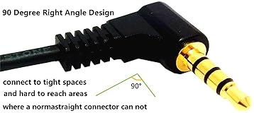 4 Pole TRRS Support Mic/Audio:This 3.5mm TRRS Audio Cable has 4 conductors (tip,ring,ring,sleeve),not only supports audio transmission,but also connects to a microphone where you can listen and speak at the same time. 90 Degree Right Angle Design:This 3.5mm 90 degree angle stereo Aux cord enables you to connect in tight spaces and hard to reach areas,which the 3.5mm straight plug cannot be connected. Universal Compatility:This 3.5mm male to female audio cable is suitable for devices with standard 3.5mm auxiliary stereo jack,eg MP3 player,headphone,TV box.PC,car,laptop,DVD Player,TV, Superb Sound Quality: Gold-Plated connectors,ensure the high fidelity of sound quality and provide a better performance for signal transferring and corrosion resistance. Slim Connector:This 3.5mm stereo jack to be easily plugged into your headphone jack without taking off your slim phone case.reducing the number of plugs and unplugs, protecting the equipment socke.