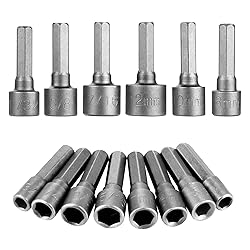 Hex-Shank length: Approx 2.2cm, Hex-Shank diameter: 1/4 inch (6.35mm) 14Pcs Hex Sockets Include: 3/16(4.76mm), 1/4(6.35mm), 9/32(7.14mm), 5/16(7.93mm), 11/32(8.73mm), 3/8(9.53mm), 7/16(11.11mm), 5mm, 5.5mm, 6mm, 7mm, 8mm, 10mm, 12mm Universal 1/4'' Hex Shanks Fits Most Motorized Corded or Cordless Drills. Easy To Install And Disassemble, No Easy Dropping During Use Nut driver made of high quality chrome vanadium steel materials, surface sandblasting, strong rust and corrosion resistance, the high temperature quenching treatment improves the durability and service life Widely used in Household DIY, Woodworking, Auto Parts, Professional Machine Repair, etc. Suitable for Hexagon Tools Such as Pneumatic Screwdriver, Electric Screwdriver, Pneumatic Drill, Electric Drill, Pistol Drill, Hand Screwdriver, etc
