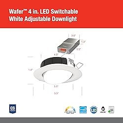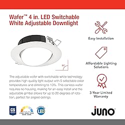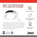 ADJUSTABLE LED CEILING LIGHTS: The Juno LED adjustable recessed ceiling light is great for residential and light commercial applications; Use it as a shower light, kitchen ceiling light, or outdoor ceiling light VERSATILE 5-IN-1 RECESSED LIGHT: LED light offers 5 white color temperatures (soft, warm, neutral, cool, and daylight) to create the right ambiance for any space; Gimbal is adjustable with up to 20 degrees of rotation making it great for angled ceilings DURABLE RECESSED LED LIGHTS: Polycarbonate injection molded outer frame with steel back plate ensures excellent thermal management and durability; Features an all-in-one LED engine with polycarbonate lens that provides even illumination EASY INSTALLATION: Canless design and steel spring clip make installation; Cut out template is provided to ensure a correct sized hole is cut into ceiling for proper installation; Wet rated and air-loc for showers, bathroom ceiling light, and outdoor use SPECIFICATIONS: Dimensions - 1.5" H x 5.3" W; 729 Lumens; Dimmable (Triac dimming) from 100% to 10%; 120V; 90+ CRI; CSA certified to US and Canadian safety standards; IC Rated; Maintains 70% output at 50,000 hours; 3-year limited warranty