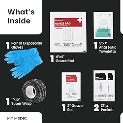 - The ZZIPS MedPack is a compact, all-in-one first aid kit designed to quickly and effectively close cuts and lacerations—an innovative alternative to traditional sutures and stitches. Featuring adjustable zip-tie closures, it allows for fast, safe wound care on the go. This lightweight and portable kit is equipped with everything you need for wound treatment: laceration closures, gloves, a wound cleansing towelette, a gauze roll, gauze pad, and a self-adhesive wrap bandage. ZZips wound closures are designed for a pain-free application, easily attaching to both sides of the cut to securely close the wound. Simply attach the closures to both sides of the laceration and adjust the tension using the adjustable hasps. They are an excellent alternative to sutures, skin glue, and butterfly bandages. Whether you're at home or traveling, the ZZIPS MedPack ensures you’re ready to handle emergencies with confidence.What’s included:2 ZZip Packets - Quick and easy zip tie closure first aid device for laceration 2” Gauze roll with conforming stretch1 pair of disposable gloves5” x 7” Antiseptic towelette - to clean cuts, scrapes, and burns 4” x 4” Gauze Pad - for skin protection and wound care1” x 15’ Super Wrap - Lightweight compression bandage which sticks to itself About Us:At My Medic, our mission is to empower people with the skills, knowledge, and first aid supplies to save lives. Life can be dangerous. Whether you’re at home, in your vehicle, or out on an adventure, our products are ready to perform when you need them most. Our first aid kits are stocked with the highest quality gear, convenient features, and specialty tools that you won’t find anywhere else. Experience Elevated First Aid with My Medic.