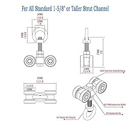 ✔️【Heavy-Duty Build】 Bearing Trolley Assembly Made with Hot-Rolled Carbon Steel of solid steel for impact resistance. Galvanized to ensure rust resistance of wheeled trolleys. Smooth and noiseless during use, bearings and pins are firmly welded, work stably, Resulting In Incredible Strength and Quality! ✔️【Design load】320 lbs at 600 rpm; 450 lbs at 300 rpm; 650 lbs at 100 rpm. Break strength: 5511 lbs. ✔️【Trolleys Size】M10 (3/8inch) Bolt in the middle, 80mm (3.15inch) in length.For use with 1-5/8" Wide and All 1-5/8" or Taller Strut Channel. ✔️【Rust-proof design】Channel Trolley body hot-dip electrogalvanized steel,Eye nut and M10 bolt are made of stainless steel. ✔️【Quality Service】For use with 1-5/8" Wide and All 1-5/8" or Taller Strut Channel.If you have any issues with the Wheel Trolley then just let us know and we will solve it for you within 24 hours to ensure you are completely satisfied.