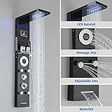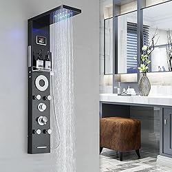LED Shower Panel Lights: The rain shower head has LED lights, the blue light from the nozzles bring you a more comfortable bathing experience. And there is a temperature display that assist you to select the best water temperature to bath. 5-Function Tower Shower Panel: shower panel features built-in LED temperature display (need five 5V battery), LED rainfall shower head, body jets, tub spout, and 2-function handheld spray, you can combine shower panel functions as you like. Easy Installation: The black shower panel system is wall mounted, requiring just four holes on the wall. Once the shower panel is assembled, it can be directly hang on the wall. All accessories are included in package, installation simple, no need for installation workers, saving installation cost. Shower Panel System Material: The shower panel system is made of durable 304 stainless steel, features corrosion-resistant, High temperature resistance, and longer useful life. The pressure balance valve cartridge monitors water pressure balance to protect you from scald due to sudden changes of pressure of hot or cold water. Warantty and After-Sale Service: Five-year warranty is provided. If there are any quality or installation problems of the product, please feel free to contact us, and we will solve it for you within 24 hours.