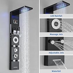 - 5-Function Shower Panel System: shower panel features built-in LED temperature display (need five 5V battery), LED rainfall shower head, body jets, tub spout, and 2-function handheld spray, you can combine shower panel functions as you like.