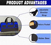 Material Characteristics: Color: Blue. High quality 1680 double layer thick Oxford cloth, which is wear-resistant; scratch resistant; tear resistant; waterproof, and has a long service life. The overall size is 22L x 9.84H x 8.66W inches Structural Features: Large capacity. Open top double zipper. A total of 17 pockets of different sizes. Built in 11 small pockets of different sizes, suitable for holding tools of different sizes. There are 6 pockets on the outside. Includes: 3 Velcro pockets and 3 open pockets. More tools can be stored to make storage more convenient, easy to classify and manage Carrying Method: Equipped with an extended and widened shoulder strap. It has adjustable features and is suitable for most people to wear. Featuring a thickened and widened handle design, it can reduce hand pressure and friction. Enhance user comfort. The connection is equipped with a metal ring mouth, which can be carried from multiple angles Metal Zipper: Bidirectional metal zipper. Made of high-quality materials. Not easily damaged. The connection between the zipper and the tool kit is sewn in a special way. Not easily torn or damaged. Durable service life Multiple Occasions: The bottom is equipped with rubber anti slip design, which can increase the stability of the tool kit. Suitable for survival in various harsh environments. Very suitable for storing various professional maintenance tools, used for electrical, plumbing, woodworking, automotive, home DIY, etc