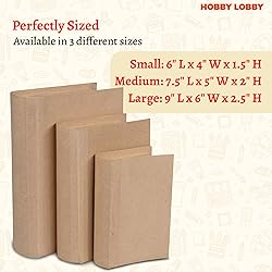 - Hobby Lobby Rectangle Book Storage Boxes (Set of 3, Brown): Craft and customize with our rectangle paper mache fake books for decoration—a blank slate for your creative projects. This set of three kraft brown decorative storage boxes for shelves—large (9" L x 6" W x 2.5" H), medium (7.5" L x 5" W x 2" H), and small (6" L x 4" W x 1.5" H)—invites you to turn bland to grand. Personalize these versatile fake decor books for shelves with your favorite paints, fabrics, or designs to create faux books, hidden storage decor for keepsakes, or stylish decor for bookshelf. Perfect for book lovers and DIY enthusiasts, these faux decorative books for home decor offer endless possibilities for custom home accents or thoughtful gifts. Turn these paper mache books into one-of-a-kind creations that reflect your style. --- About Us: Hobby Lobby offers over 70,000 items featuring home decor, seasonal decor, tableware, floral, art supplies, craft supplies, yarn, fabric, jewelry making, hobbies, and much more. What began as a $600 start-up, continues to grow and expand–enabling customers nationwide to live a creative life.