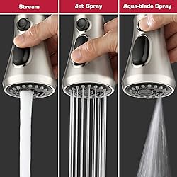 🚿【3 Water Flow Modes 】Pull down kitchen faucet head replacement with 3 water flow mode. Jet Spray, Aqua-blade Spray and Stream will bring you an excellent kitchen time. Unique aquablade is a supper strong water flow, which can easily flush away the food debris. Simply press and release the button to switch between 3 modes. 🚿【High Quality and Well Made】Elegant design and precise structure with the fine coats for durability, effectively withstands daily rust and tarnishing.The built-in filter is effective to protect your sprayer nozzle from impurities in water and make the kitchen faucet sprayer head and hose more duarable and let you be more healthy. 🚿【11 Adapters】The faucet spray head replacement provides 11 adapters compatible with major brand faucet hose connectors, not limited to compatible with Moen, Delta, AquaSource, Kohler, Hansgrohe and Grohe. Particularly, not compatible with Pfister or Glacier. 🚿【Easy Maintenance&Installation】A free aerator key included for removing or replace the faucet aerator to clean. No extra tools needed at all, just remove the defective sink sprayer head from spray hose and screw on the new one, securely attach to your set up without leaking or dripping. 🚿【Removable & Washable Faucet Aerator】A free aerator key included for removing or replace the faucet aerator to clean. The interior multi-mesh aerator creates perfect quiet no-splashing aerated stream, with most impurities being filtered out. The aerator can be removed and cleaned to ensure clean water and continuous flow.