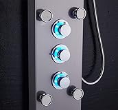 LOWER Water Pressure: If the water pressure has decreased, please refer to the manual to clean the water impurities in the filter, which is the main cause of the decrease in water pressure. Feel free to contact us for assistance. Superior Shower Experience: Transform your shower into a luxurious spa-like retreat with our high-quality Shower Panel. Experience the soothing sensation of rainfall, the invigorating power of body massage jets, and the convenience of a handheld shower all in one sleek design. Sturdy and Durable Construction: Crafted from premium stainless steel, our Shower Panel System is built to last. The robust waterway is made with a combination of brass and PVC pipes, ensuring long-lasting durability with minimal risk of leakage. Powered by water flow: With LED lights and temperature display, our Shower Tower offers easy control over your shower experience. Adjust the water flow and temperature to your liking, providing a personalized and enjoyable shower every time. Versatile Shower Modes: Enjoy a variety of shower modes with our full body shower system. From a gentle rain shower to a powerful waterfall, from invigorating body jets to a relaxing tub spout, you can switch between different modes to suit your mood and preferences.
