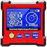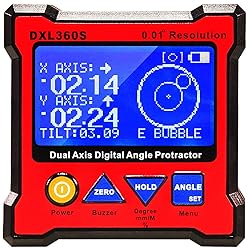 - Description: Using this axis digital angle protractor, you can measure the angle between two faces, not only in earth gravity direction. Press Angle key at the first face, and then rotate slowly and must keep the rotation axis to another testing face, then it will show the angle once you not move the unit. Any angle measurement is using gyro technique. Specifications: Color: Red Accuracy: 0 to 20°: ± (0.05°) 20 to 70°: ± (0.1°) 70 to 90°: ± (0.05°) Measuring Range Single Axis: 360° , Dual Axis: ±40° Resolution: 0.01° Response time: <0.4 second Zero offset drift angle per °C: 0.0058°(typical) Operating temperature: 0 to 50°C (32 to 122℉) Storage temperature: -10 to 60°C (14 to 140℉) User Interface: Mono-color LCD with backlight Supply Power: Rechargeable Li-Polymer 3.7V Charger port: 5V 500mA Mini type-B USB port Power Consumption: tandby: 10uA, Operation: 20mA Standby Battery Life: 4000 hours Operating Battery Life: 40 hours Magnetic Base: set on 4 corners Magnetic Force: N48 Item Size: Approx 7 x 7 x 2.8cm / 2.7 x 2.7 x 1.1in Item Weight: Approx 119.7g / 4.2oz Package Size: Approx 17 x 13 x 4.5cm / 6.7 x 5.1 x 1.8in Package Weight: Approx 250g / 8.8oz Package included: 1 x DXL360S Dual Axis Digital Angle Protractor 1 x AC Adapter 1 x English User Manual