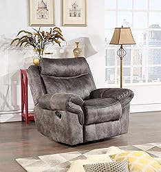 - The Nashville Grey Glider Recliner brings incredible comfort to a room whether reclined or closed. The built-in Glider mechanism adds a comforting gliding motion to the chair while the outside manual lever puts you in a full recline at the flip of a switch. The faux-suede cover is soft to the touch and complements any room with its neutral grey colored cover. Generous arms in an overlapping design add ample padding to complement the lavish seat cushioning for a relaxing reclining experience.