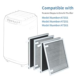 【What is Included?】Including 2pcs stainless steel pre-filters and 2 pcs activated carbon coated filters . 【Fine pre-filter】The fine stainless steel pre-filter helps to trap large particles such as dust,pollen and pet fur 【Odor Filter】The activated carbon coated filter helps to absorb unwanted household odors such cooking odor,pet odor,smoke and VOCs 【Compatibility】Replacement filters are compatible with Nuwave Oxypure Zero air cleaner purifier model number 47351, 47251, 47261 【Replacement Frequency】It is recommended to replace the filter every 6-12 months depending on using environment