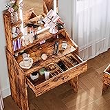 LIKIMIO Small Makeup Vanity Desk with Mirror and Lights, Vanity Table Set with Storage Drawer, Chair and Three Shelves, Bedroom, Vintage Brown