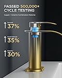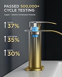 Effortless 1-Hole Setup: Designed for bathroom faucet 1 hole installations, our 6.49-inch deck plate fits standard sinks perfectly. Video tutorials let DIYers install in minutes—no plumber needed Anti-Splash Waterfall Design: Our bathroom sink faucet features a waterfall spout to reduce splashing. Ideal for compact spaces—maintains strong flow even with low pressure. Modern style meets practical performance Leak-Free: Built with a ceramic cartridge tested through 500,000 cycles, this bathroom faucet resists hard water. Smooth handle control ensures drip-free operation for years, Flow rate: 1.2gpm/4.5L/min at Max 60psi Everything Included: This bathroom faucet 1 hole comes with 3/8 threaded 24-inch hoses, a metal pop-up drain, and US-standard fittings. Pre-tested parts ensure instant installation—no extra purchases or delays Fingerprint-Resistant Brushed Gold Finish: Our brushed nickel bathroom faucet uses brushed gold finish to repel water spots. Maintains a sleek, modern look in high-humidity bathrooms Lead-Free Compliant: This bathroom faucet is certified by NSF/ANSI/CAN 61 standards—the standard for product safety.