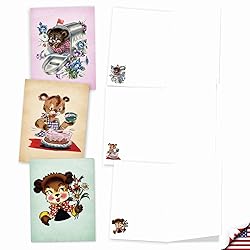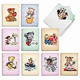 - With adorable, old fashioned baby bears on the covers and interiors of all twenty cards in this ten design collection, the cuteness and cheerfulness of these All Occasions greetings is just about ""unbearable."" All of those special children, or adults, you know who could use a good smile and some great laughter in their lives, for whatever reason, will be grinning and chuckling with gusto when you gift them any one of the playful bear missives. In bright, boisterous, watercolor painting portraits, retro cubbies are exuberantly pictured hugging hearts, sitting on water barrels, holding flowers, mailing letters, opening cards, engineering steam locomotives, riding hobbyhorses, fishing in rowboats and baking cakes. Grin and bear it, indeed!