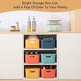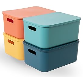 【Great Size】Single measuring: 9.65"L x 6.9"W x 6.3"H; Package includes 4 small storage bins with lids, Comes with 8 different shaped labels and 1 marker. Our customizable labels make storing and accessing belongings a total breeze. 【Durable and Sturdy】Made of durable, sturdy plastic, BPA-free, Lightweight and Durable. 4 selected colors add a stylish and cheerful touch to any surrounding décor, and you can distinguish your own stuff according to the different color bins. 【Stackable with Handles】Keep your pantry or space neat and organized as these storage baskets have a lid that allows stacking them up easily and stacks neatly in small cabinet spaces. Also, its convenient cut-out handles give you a comfortable grip allowing you to carry them around easily. Stackable and easy-to-access containers, keeping things tidy while taking up very little room. 【Functional and Versatile】Use these organizing bins to store cleaning supplies, records and books, small toys, art & craft supplies or any other items that need a home without creating a mess. You can use them in any room of the home, such as in kitchen, pantry, closet, craft rooms, laundry rooms, bedrooms, bathrooms, kitchens, offices, garages, toy room, playroom and more. These handy small baskets for organization are great at keeping your odds 'n ends compartmentalized! 【Simple and Attractive】These storage containers with lids were designed to blend perfectly into your home or office decoration and to hide in plain sight. Perfect for storing and organizing small personal items on shelves, they fit in effortlessly with your home décor.