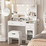 【Upgrade Functional Design】Built-in Charging Station, this makeup vanity add 2 standard plug sockets and 2 USB ports, you can easily use hair dryer, curling iron in front the large mirror, and charge your phone or other mobile devices during makeup. Nice make up vanity for bedroom, dressing room, salon or live broadcast. 【Super Large Capacity】Constructed with spacious desktop and lots storage shelves, one large drawer, one small drawer, 3 storage compartments and a visible storage cabinet, all of your cosmetics, daily stuffs or handbags, storage boxes can easily find their places. We also add a metal rack for hair dryer, more convenient access and storage. And there is an extra storage space under the comfortable stool. 【Visual Cabinet & Necklace Hooks】Spacious cabinet with visual glass door, elegant look and more convenient to know what is stored inside. The 5 hooks under the upper storage shelf, make your necklace and earrings neatly arranged and displayed. 【3 Lighting Modes & Brightness Adjustable】This wood vanity features a large mirror and 10 LED bulbs, with 3 different color modes: warm yellow, natural light and bright white, can match your different makeup needs. A big surprise for her on birthdays, Valentine's Day, Mother's Day or other anniversaries. 【Happy Experience】Perfect size vanity set with mirror and stool: 39.8(W)*15.7(D)*53.6(H)in. Step-by-step instructions in the package, all parts and accessories are labeled. Any installation question or other issues, just click “contact seller” to get satisfied solutions, no need to return. Anti-tip Device behind the vanity mirror, you can fix it on the wall for children’s safety.