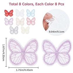 - GORGECRAFT 64Pcs 8 Colors Butterfly Lace Trim Embroidery Butterflies Appliques Sew Iron On Patch Organza Patches Sewing Fabric Embellishments for Wedding Bridal Hair Clothes Dress Decor DIY Craft Features: [64Pcs 8 Colors Butterfly Lace Trim]: Come with 8 colors butterfly sewing appliques, pink, blue, purple, gray, yellow and so on, each color has 8pcs, 64pcs in total, enough quantity and rich styles can meet your multiple DIY needs. [Product Size]: The embroidered butterflies ornaments are about 1.75 inch(44.5mm) wide, 1.67 inch(42.5mm) long, 0.04 inch(1mm) thick, proper size to meet your decorative needs. [Organgza Material]: These butterfly lace trims are made of high quality organza, reliable, not easy to deform, tear and break, and can keep for a long time. [Ideal Gift]: The butterfly embroidery accessories have a delicate design, beautiful appearance, with exquisite craftsmanship, is a nice gift for your family, friends, colleagues and more on wedding Christmas, Halloween, Valentine's Day and other festivals. [Multiple Applications]: Organza butterfly appliques can be patches or charming decorations. Excellent for brides dress, evening dress, wedding gown, dance wear, bridal headpiece, hair clip, bridal gown applique, bridal sash sewing, decorating, hair bow making, embellishing cards, packages, clothing, refrigerator stickers, brooches, headbands, garters, bouquets, decorating gift baskets, curtain decoration, bedding decoration, home textiles accenting and other crafts. Color:Mixed Color Size:1.75x1.67x0.04 inch