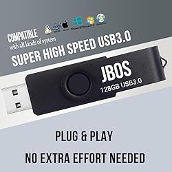 Super Fast Speed USB 3.0 Jump Drive 128GB - USB3.0 fast transfer speed ensure your files are moved in the blink of an eye. You can effortlessly transfer large files, videos, and photos in seconds Plug and Play, Portable Storage Solution - This USB drive 128GB provides ample space to store and transfer your important data without any hassle. Easy usage without additional software. Ideal for work, school, business, daily use, or travel. Store and share music, photos, documents, movies, programs, and more. Efficient file uploads in office, home, events, with clients, friends, or between machines USB Drive 128GB 3.0 of Wide Compatibility - Our USB 3.0 flash drive is backward compatible with USB 2.0 ports, ensuring it can be used on older devices without sacrificing speed. It works seamlessly with various operating systems, including Windows 7 / 8 / 10 / Vista / XP / 2000 / ME / NT Linux and Mac OS Carry your digital world in your pocket with versatile and lightweight pen drive 128GB USB 3.0 - JBOS memory sticks have a 360° swivel aluminum cover protecting the USB connector. An eyelet hole at the end allows for easy attachment to your key chain, backpack, or lanyard. Take your data anywhere with safety and ease. Compatible with USB devices like computers, TVs, speakers, notebooks, and car audio systems. Store and transfer file formats like MP3, MP4, RMVB, EXCEL, WORD, PDF, Images Ensure safety of files and record memories - JBOS pendrives have wide applications in schools, colleges, universities, commercial, government, media industries, engineering, healthcare, construction, CPA, attorney, photography, and more. Perfect as storage gifts for birthdays, teacher's day, children's day, Christmas, weddings, graduations, and company meetings. Use them as bootable devices, for installing OS, running portable apps, or storing music in car audio systems