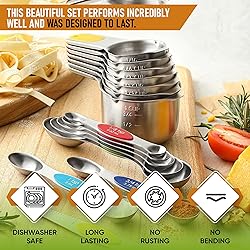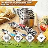 Treat Yourself To A Set Worth Having - With single metal construction and heavy duty premium Stainless Steel, these measuring spoons and cups were built with endurance in mind. They won't rust or bend. This beautiful set performs incredibly well and was designed to last. Magnetic For Easy Use And Storage - These magnetic cups and spoons let you use one spoon or cup at a time and then they nest together for easy storage. Quickly grab the spoon or cup you need without having to fumble with opening and closing a ring. They even have U.S. and metric measurement markings that are easy to read and won't fade or rub off. Dual Sided Spoons and Cups With Pour Spout: Oval end is narrow to fit into most spice jars. The round end is perfect for liquids. The spoons also lay flat on the counter without spilling their contents. Cups have a pour spout for liquids. All pieces are dishwasher safe. Complete, Accurate Set To Measure Medicine, Spices And More - Precise quantity of ingredients is what you need to get great results with cooking and baking. It's even easier now with the included Leveler that helps you measure the exact amount required the first time. Set Includes 7 spoons in Convenient Sizes: 1/8 tsp, 1/4 tsp, 1/2 tsp, 3/4 tsp, 1 tsp, 1/2 Tbsp, 1 Tbsp plus Leveler and 7 cups: 1/8 cup, 1/4 cup, 1/3 cup, 1/2 cup, 2/3 cup, 3/4 cup, and 1 cup.