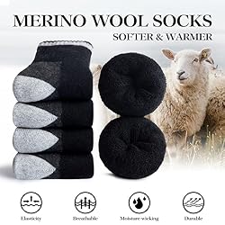 [Extra Thickness for Unmatched Warmth]: Dive into unparalleled warmth with our wool socks mens, featuring an extraordinary 2.0 times thicker profile compared to regular wool socks. Our substantial thickness guarantees superior thermal performance, ensuring your feet remain snug and toasty even in the most frigid winter conditions. Say goodbye to cold feet with our wool socks. [Ultimate Comfort]: Our mens socks are knitted from a top-quality blend of Merino wool, nylon, and spandex. This combination provides remarkable elasticity, unmatched softness, and cushioned support, alleviating the pressure on your feet for enduring comfort. They are built to last, reducing the risk of blisters and discomfort. Furthermore, embrace sustainability with these Merino wool socks for men; they're animal-friendly sourced and machine washable for your convenience. [Stay Fresh and Dry]: Featuring the thermoregulating Merino wool and moisture-wicking properties, our wool hiking socks for men offer exceptional breathability, keeping your feet dry and odor-free, no matter the activity. Say goodbye to sweaty, uncomfortable feet. [Versatile Performance]: These men's wool socks serve as mens dress socks,mens crew socks,mens work socks,boot socks for men,thermal socks, mens winter sock, warm socks for men, mens hiking socks, moisture wicking socks men,hunting socks,thick socks for men, and even make for great Christmas surprise for fathers, husbands,brother,son or friends. Whether you're hiking,camping, skiing,walking,running,cycling or sleeping, these wool socks offer the performance and protection you need. [Exceptional Customer Support]: Each pack includes 5 pairs of these premium wool socks, fitting USA sizes 7-13. We are dedicated to your satisfaction. If you have any questions or concerns about our product, do not hesitate to reach out. Our devoted team is here to assist you. Choose comfort, warmth with SIMIYA Merino Wool Socks.