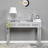 Mirrored Console Table : The mirrors on the vanity reflect floors and furnitures and it looks gorgeous in the room. The faux diamonds decoration on the drawers surface makes this table even more charming Multifunction Mirrored Desk : This silver finish mirror desk can be used as an entryway table for your entryway, a sofa table placed behind your couch, or makeup vanity table that highlight your bedroom. Grace your home with the illusions collection mirrored entryway console Ample Storage Space : The spacious table top measures 42 inch x 15 inch, perfect for a couple decorative items. Features 3 drawers with faux crystal knobs for storage and easy access to your various kinds of cosmetics or stuffs Solid Construction : This table is made of premium density board with mirror finish. It is very sturdy and holds up to 43lbs. The understated modern style allows it to blend in seamlessly with any interior decor styles Easy to Assemble : The table top part is pre-assembled, all you need to install is the legs and the knobs for drawers. (NOTE: DO NOT SCREW THE KNOBS ON TOO TIGHTLY). Mirrored desk is packaged well to avoid any cracks or chips, If your table has any quality problem, please feel free to contact us