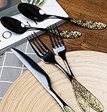 TWEE Black Gold Silverware Set for 16 Unique 18/10 Stainless Steel 80 Flatware Set Beautifully Embossed Floral Pattern Mirror Polished Kitchen Utensils Set for Home Restaurant Tableware