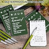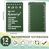 Package Includes: our package includes 12 small spiral notepad in dark green and 12 multi tool pen, enough quantity to meet your writing and replacement needs, you can also share them with your friends Weatherproof for Most Conditions: our weatherproof notebook ensures that your notes stay legible no matter the weather condition; Rain or shine, this field notebook can be applied in these conditions; An ideal accessory for outdoor professionals or adventurers Multifunctional Multi Tool Pen: apart from writing, these tactical pens include a variety of functions, such as level, ruler, slot, screwdriver and stylus, designed to serve you in unforeseen circumstances; Both versatile and practical, they give an entirely convenient meaning to the pen Thoughtful and Versatile Gift: this set of construction notepad and multi tool pen makes a thoughtful gift for travelers, field workers, or people who love to stay organized, conveying your love, care and kindness to them, getting relationships and emotions closer with each other Wide Application: beside taking notes, this pocket notepad can serve a wide range of purposes; Construction notepad for site inspections, tactical pens for emergency use, or an everyday tool for your creative thoughts, offering you a comfortable using experience