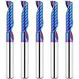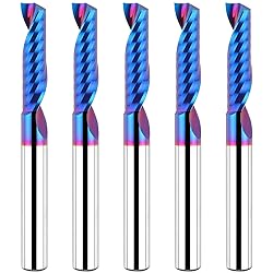 - EANOSIC 5 PCS Solid Carbide Blue Nano Coated O Flute Spiral Router Bit with 1/4 inch shank Plunge CNC End Mill -Industrial quality control to ensure best performance The Design of Single Flute, Larger Spiral Chip Space and Mirror Polishing of CNC Router Bit Makes Non-stick Crumbs, Smooth Cutting and Fast Chip-removal. Used for Carving, Cutting, Slotting, Milling, Hollow Cutting in Materials Like Hardwood, Medium Density Board, Nylon, Resin, ABS, Acrylic, PVC, MDF, etc. - HIGH PROCESSING EFFICIENCY: The edge of end mill bits is HARD and SHARP, process the heat treatment materials under 32° with high speed, reduce changing times and improve the production efficiency. - STRONG and DURABLE: The Blue Nano Coating with High Hardness and Heat Resistance. - Straight shank handle, rounded chamfer design for easy installation and improved work efficiency. Specifications: Flute: 1 Cutting Diameter: 1/4" Cutting Length: 1" Shank Diameter: 1/4" Full Length: 2-1/2" Material: Solid Carbide Package Contents: 1 * Single Flute Spiral Router Bit