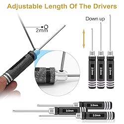 19 Pcs Complete RC Tool Bag:4 * hex screwdriver set (1.5mm 2.0mm 2.5mm 3.0mm), 4 * hex nut driver (4.0mm 5.5mm 7.0mm 8.0mm), 2 * phillips driver (3.0mm+ 4.0mm+), 2 * slot screwdriver (3.0mm- 4.0mm-), 2 * pliers (needle-nose, diagonal), hole puncher reamer, craft hobby knife (with 6 blades), cross wrench, rc ball bearing driver, rc screw tray and zipper storage bag, all types of tools can meet your different needs Widely Application: hexagonal screwdriver rc tool set for rc cars, rc helicopters, rc boats, robots, 3D printers, traxxas axial arrma DJI drone and other hexagonal screws removal, not only is it an indispensable tool for modeling enthusiasts, but also suitable for home use to meet a variety of maintenance needs Durable and Long-lasting:This set of screwdrivers is made of high quality material with a hardness of over 60 to prevent wear, rounding and screw damage. The hobby knife comes with 6 sharp blades and includes 2 protective caps to safely store your craft knife. RC ball bearing driver for 9 bearing sizes Exquisite Workmanship: Well-designed non-slip handles with clear markings, novel appearance, comfortable grip, easy to identify and use, improve work efficiency. The pliers set features non-slip rubber grips and spring-loaded openings to ensure safe use and avoid accidental injuries. The reamer punch is designed with curved blades to easily cut rc car shells, saving time and effort Convenient Storage: This set comes with a magnetic tray that attracts and holds a variety of screws and small parts, preventing them from getting lost or scattered. Professional and neat zippered storage pouches keep tools neatly secured in their designated locations, elastic straps hold tools firmly in place to prevent them from falling out, extremely easy to organize and access, perfect for storing and carrying