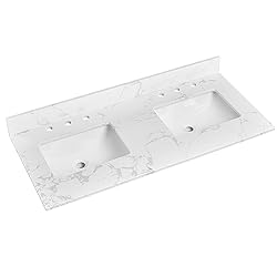 😊【Dimensions】 The bathroom vanity's top dimensions are 48 in wide x 22 in deep, with a 4 in height backsplash, which can be attached to a standard 48 in. W x 21 in. D vanity for a custom look. 🌟【Premium Material】 The vanity tops are made of heavy-duty Engineered Stone. Complement most Bathroom designs, which are high hardness, waterproof, easy to clean, and anti-scratches. 💦【Efficient Design】Equipped with a 4-inch backsplash and an overflow hole, this vanity top provides excellent protection against water splashes, keeping your bathroom clean and dry. 🛠️【Easy to Install】 Top pre-drilled for 8 in. faucet spread with double assembled rectangular sink. This top is perfect for quick and easy remodels, you can easily complete the countertop installation. 📦【Package Includes】 Engineered stone vanity top with assembled rectangular double sinks, 4" high backsplash. Besides, an extremely solid package - Reinforced packaging making sure a safe delivery. (Attention: faucet and side splash NOT INCLUDED).