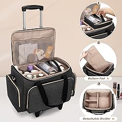 PROTECTIVE: Made of heavy-duty nylon. Thick padded interior keeps your makeup in good condition when transporting. A removable bottom padding pad to reduce the risk of bumping. MAIN COMPARTMENT: The main section with a detachable divider and 3 individual removable cases for organizing makeup, skin care kits and hair supplies (The clear top helps to see what is stored inside). There is also a mesh zipper pocket to keep face masks and some flat items. TOOL STORAGE: The front section (with pockets & elastic bands) and 2 side mesh pouches provide roomy space for holding brushes, lipsticks, eyeshadow palettes and the like. We also provide a roll-up makeup brush bag to keep 20 pcs brushes. PORTABLE DESIGN: Attached with sturdy handles, a detachable shoulder strap and a detachable dolly (the telescoping handle can be extended to 36.5"). DIMENSIONS: Whole bag (16.5” x 9.5” x 11.5”), 3 small cases (8.75” x 7.5” x 3.25”), makeup brush bag (open size: 19" x 9").