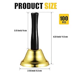 - Features: This loud service bell can also serve as a decoration, you can just put it on your desk or hang it on your wall, can make your room look elegant and pretty. This metal handheld ring is a considerate and pragmatic present to your family members, friends, conveying your love, care and kindness to them, getting relationships and emotions closer with each other. Specifications: Material: metal and plastic Color: black, gold Size: Diameter: about 2.56 inches/ 6.5 cm Height: about 4.53 inches/ 11.5 cm Weight: about 48 g Package includes: 100 x Hand bells Notes: Manual measurement, please allow slight errors on size. The color may exist a slight difference due to different screen displays.