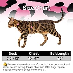 Escape Proof Cat Harness: This cat harness wraps securely around the neck and chest preventing any chance of escape. The simple design takes the strain off your cat's neck and back, even them won't notice wearing it. Walk easily and say goodbye to escaped kittens Comfortable & Safe: The cat harness escape proof is light, soft, breathable, skin-friendly, and bears no weight. Harness for cats is comfortable to wear, and it will not stick hair and hurt the skin even if it is used for a long time. Easy to clean and dry quickly, no smell Easy On/Off: Strong ABS quick release buckle, easy to adjust and put on/off. Lighter than metal buckles, more comfortable to wear. Stainless steel D-rings are durable and secure for securing kitten harness and leash set Adjustable: Neck 7.8"-12", Chest 10.2"-16", Belt Length 48". Adjustable plastic buckle to best size for most cats. Please measure your pet's neck and chest girth before ordering cat leash and harness Easy Control Your Lovely Pet: The PetThem easy walk cat harness and leash set provides a safe option for your feline friend to explore the world. the unique pattern design will make your cat stand out from other pets and add luster to your daily life