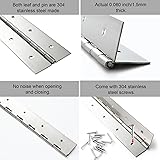 【Heavy Duty Piano Hinge】Made of actual thick 0.060''/1.5mm high-quality 304 stainless steel (most hinges actual thickness not exceeding 0.047"/1.2mm). Ensuring our 12" heavy duty piano hinge has superior load-bearing capacity, perfect for various heavy-duty doors, windows, and folding furniture. 【12 Inch Piano Hinge】The package includes 2 Pcs 12'' piano hinge and screws, providing quick installation. Each knuckle of continuous hinge is a force point, which can achieve uniform weight and stress distribution and is not easily deformed after long-term use. 【Customized Length】 This 3" open width x 12" length heavy-duty piano hinge can be cut to length according to your own needs without worrying about size adaptation. 【Elegant & Silent】Continue piano hinges' surface is smooth and free of burrs after polishing treatment. The friction-type pin won't fall out, also allowing the hinge to play a certain buffering function during use, achieving a smooth and silent hinge opening and closing. 【Widely Applicable】The simple appearance and almost silent use effect of the hinge can provide better security and privacy in real life, with a wider range of applications, such as dashboard, storage cabinet, toolbox, metal plate, safety door, piano and other commercial, industrial, and household purposes.