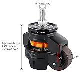 MATERIAL: The supporting frame is made of premium aluminum and steel; rolling wheel is made of wear-resistant rubber, and the foot base is made of NBR SIZE AND LOAD CAPACITY: The stem measure 12mm in diameter, wheel diameter is 2" and width is 0.94"; 4 leveling casters totally load up to 2200lbs HEIGHT ADJUSTMENT: With a built-in gear, it's easy to raise or lower the caster, height range is 3.35" to 3.75"; adjusting leveling caster independently allows the heavy duty item sit steady even on an uneven surface MULTIFUNCTION: The NBR foot base is wide and thick to provide a shock-absorption support; with the foot base retracted, the wheel rolls smoothly under heavy load GREAT FOR: Installing on workbench, vending machine, industrial equipment, welding table, wargaming table, pool table, large size cabinet and kitchen island