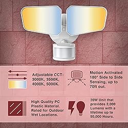 Adjustable CCT Lamp Color Switch from Warm to Bright White: 4 Lamp Colors available (3000K, 3500K, 4000K & 5000K) Motion Activated 180° sensing, Up to 70ft out, Auto On/Off with with Dusk to Dawn Photocell, Adjustable operating Time after Motion. Wall Mount or Ceiling Mount with Standard Canopy J-Box, the Light Heads can be Adjusted Right/Left and Up/Down. High Quality PC Plastic material. Rated for Outdoor Wet locations. This 20W unit provides 2,000 Lumens with a lifetime up to 50,000 Hours.