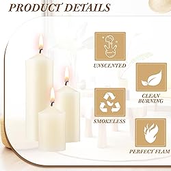 Ample Quantity: with a generous pack of 54 ivory pillar candles in 3 sizes, 18 of each size, you'll not soon run out of ambiance for your space; This package ensures you have enough supply for multiple uses or larger areas Material Composition: composed of quality paraffin and cotton wick, these plain candles offer a clean burn, ensuring both durability and safety; The use of these materials ensures a longer lasting, steady light Versatile Size Variety: these fireplace candles come in 3 different sizes, about 2 x 3 inches/ 5 x 7.5 cm, 2 x 4 inches/ 5 x 10 cm, and 2 x 6 inches/ 5 x 15 cm, accommodating different spatial needs and aesthetic preferences; This assortment of sizes enables flexibility in arrangement and application, making these candles a versatile choice for the diverse needs Creating a Beautiful Atmosphere: the soft, warm light emitted by these dripless pillar candles can create a soothing, delightful atmosphere in the space; They are suitable for setting a peaceful tone for romantic dinners, relaxing baths, or even meditative spaces Wide Application: due to their standard size and pleasing aesthetics, these unscented pillar candles can be applied in various ways, use them as centerpiece on dining tables, place them on window sills, antique trays, in study rooms, add to your fireplace mantel or incorporate them in your festive decor, or can be applied as an emergency light in case of power outage; Also suitable for daily use, weddings, events, aromatherapy, ambient lighting and more