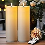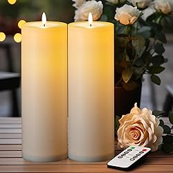 Great for Outdoor: Made of plastic, 5plots Large Waterproof Flameless Candles are suitable for outside use as they are weatherproof and won’t melt, can withstand the rain and sunlight, also work great in cold environment. They fit most indoor or outdoor lanterns, ideal for home and garden wedding, outdoor party and festival decoration. Convenient Remote Functions: You can control all these candles remotely when they are placed somewhere difficult to touch. Set a 2H/4H/6H/8H timers will save your trouble to turn them on/off because they will come back on automatically at the same time every day. Also, you can adjust the light modes(flicker/steady glow) and brightness level as you want. Easy to Use: The switch on the bottom allows you to turn the candle on / off. Just combine the atmosphere of a traditional candle with modern convenience. Bright and Long-Lasting: Vivid 3D Wick emit a bright warm yellow light, flickering slightly like natural candlelight. Each candle requires 3 x AA batteries (not included). Using advanced batteries, they can light up for 500+ hours(continuously on) / 45 days (6H timer) with high-grade batteries. Package Include: Each set includes 2 large outdoor flameless candles (12” in height and 4” in diameter) , a remote control and an user manual.